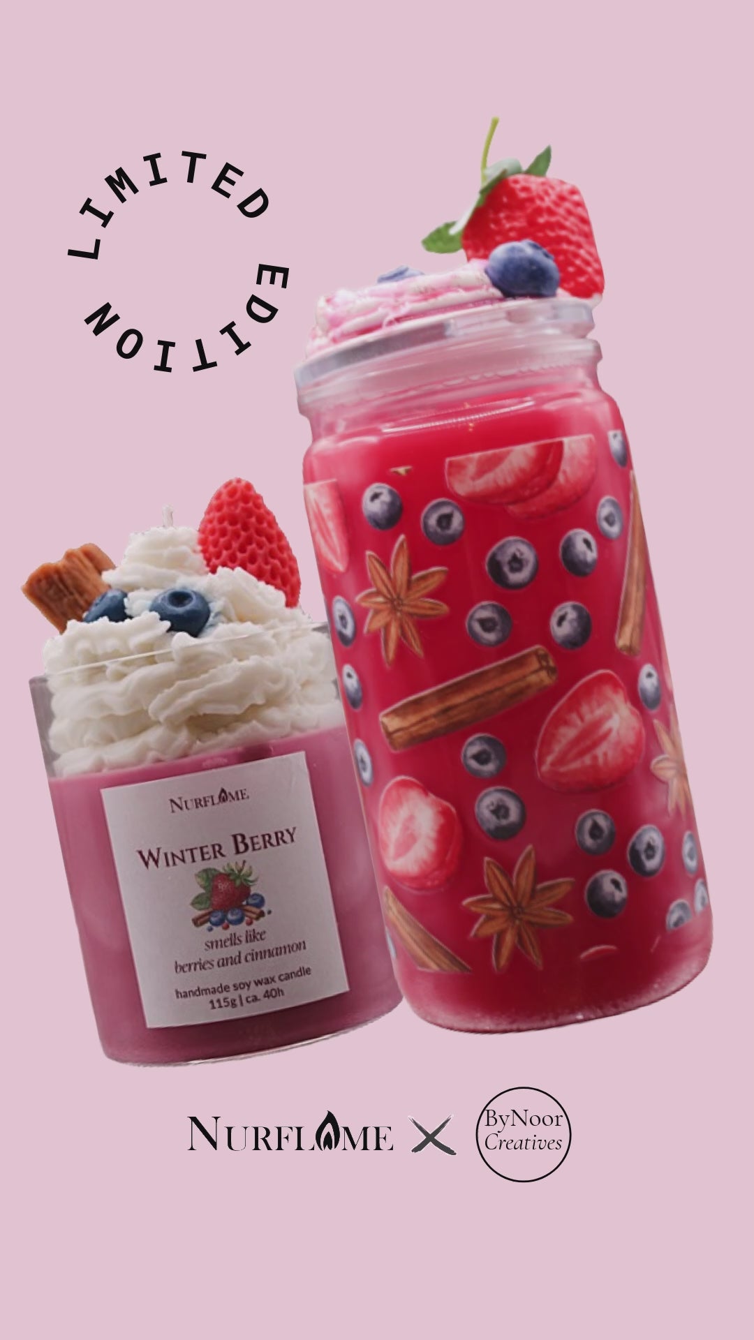 ✨ Handgefertigter Kerze „Winter Berry“ von Nurflame – hergestellt aus 100 % Sojawachs und dekoriert mit filigranen Wachsfrüchten. Der Duft aus süßen Beeren und Zimt sorgt für eine angenehme, warme Atmosphäre.